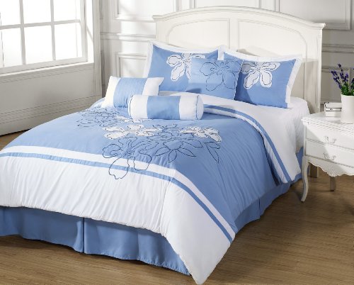 - Best feature and high efficiency on 7pc Comforter Set Applique Embroidery Light blue and white Floral Stripes Full Size Bedding